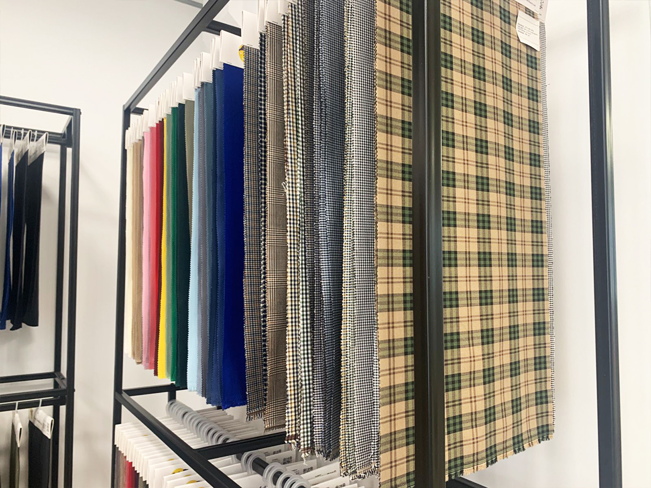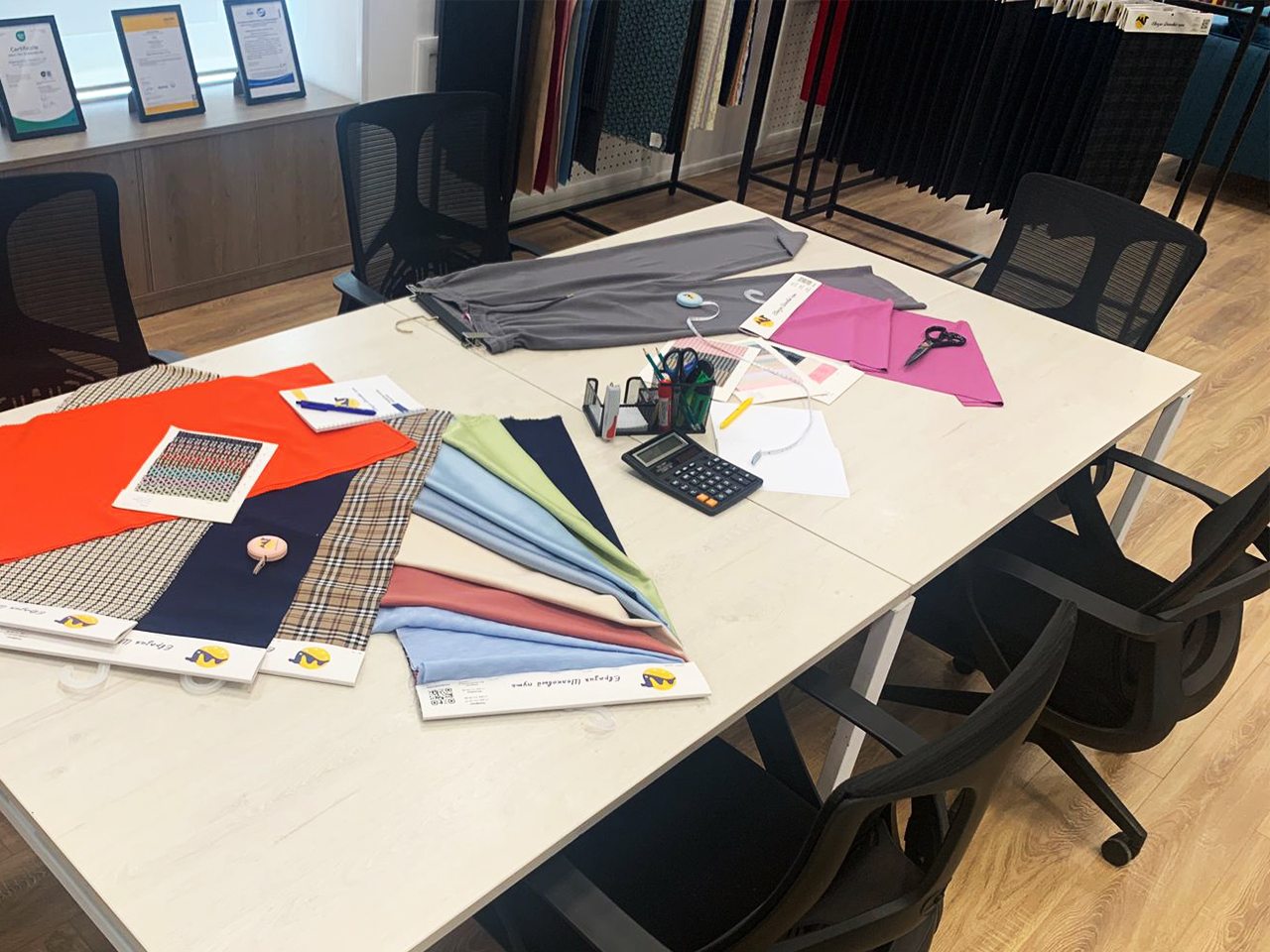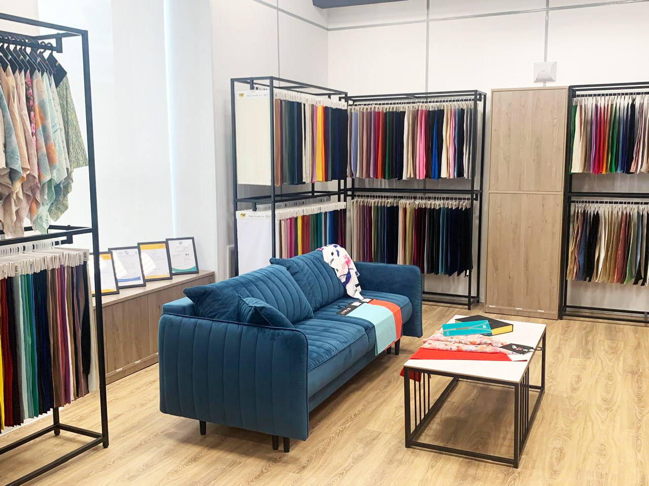 Шоу-рум площадью 120 кв.м. Здесь представлен полный ассортимент нашей продукции. Пальтовые, плательные и костюмные ткани. Ткани для пошива спортивной одежды и одежды для активного отдыха. Ткани для школьной формы и спецодежды. Бифлекс, шифон, хлопок, джерси, вискоза, трикотаж, лапша, джинса, смесовые ткани. Однотонные ткани и принты. И многое другое.